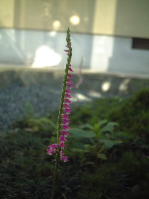 らせん状にねじれた穂状花序を作って桃紅色のかわいい花です。別名モジズリ